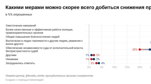 Почти половина страны считает, что ужесточением наказания: этот вариант ответа набрал 48% голосов против 45% двумя годами ранее Конструктивный и вроде бы лежащий на поверхности вариант "повысить качество работы полиции" набрал значительно меньшее число сторонников: 38%. Два года назад, кстати, их было заметно больше: 44%. Как-то не очень радует такая тенденция, как нам кажется... У другого конструктивного варианта, правда, тенденция...