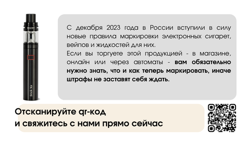 Маркировка стала обязательной с декабря 2022 года, а в том же месяце 2023 введен запрет на оборот немаркированных товаров. С этого момента продавать без маркировки нельзя. Под правила попадают: - электронные сигареты (в том числе многоразовые) - картриджи - капсулы - жидкости, включая никотиновые и безникотиновые - устройства для нагревания табака Если у вас в продаже хоть один такой товар - маркировать нужно. Все просто: штраф. Причем немаленький. Для ИП: до 10.000 рублей Для юрлиц: до 300.000 рублей Плюс - изъятие товара...
