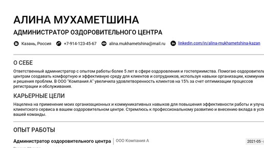 Ищете пример резюме администратора в оздоровительный центр? Изучение готовых примеров – лучший способ понять, как составить действительно эффективное резюме и уверенно претендовать на желаемую должность! ✨ На этой странице вы найдете все необходимое, чтобы составить сильное резюме администратора: Мы разберем, как правильно описать опыт, навыки и создать раздел 'О себе', чтобы ваше резюме выделялось, независимо от того, являетесь ли вы начинающим или опытным специалистом. Изучив пример, вы сможете создать резюме с помощью нашего конструктора резюме...