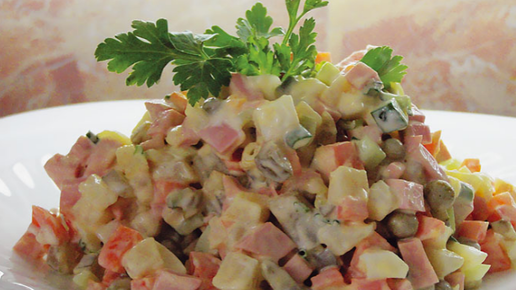 Салат Оливье. Салаты на Праздничный стол. Оливье с колбасой. Оливье рецепт классический. Рецепт Оливье с колбасой.