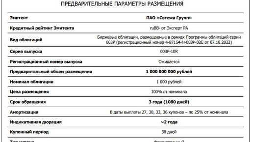 Что нужно знать инвестору перед новым выпуском Сегежи? Уже завтра стартует прием заявок на новые облигации Сегежи. Компания выходит с очередным выпуском в момент, когда интерес к доходным корпоративным бумагам сохраняется, а ожидания по ключевой ставке все еще остаются двузначными. Полноценный разбор компании и данного выпуска уже публиковался ранее, поэтому здесь решили напомнить самое главное: основные параметры и о том, что здесь действительно важно инвестору. ➖Параметры выпуска: ▪️Объм размещения: 1 млрд руб...