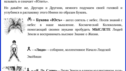 Заметил, что очень часто люди которые занимаются Грамотой Руси ВсеяСветной вводят других в ЗаБлуждения по поводу имени «Юля». Они утверждают, что это якобы нездравое sплохое Имя, которым нельзя кого-либо называть и означает «Юлить». Но давайте же, Другари и Другини, немного подумаем своей головой и углубимся в распаковку этого Имени по образам Буковъ. Ю – Букова «Юсъ» - ангел сеятель с небес. Посев знаний с небес в наше мышление. Космический Колокольчик, помогающий своими звуками пробудить МЫСЛЕТЕ Людей Земли и воспринимать высокое Знание о Жизни...