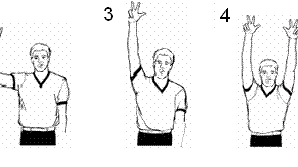I. Засчитывание мяча (рис. 1 ) Рисунок 1 – Жесты судей в баскетболе при засчитывании мяча 1. Одно очко - опустить кисть 2. Два очка - опустить кисть 3. Попытка трехочкового броска - резкое движение 4. Успешный трехочковый бросок - резкое движение 5. Очки не считать, игровое действие отменяется - быстрое разведение рук II. Относящиеся ко времени (рис. 2) Рисунок 2 – Жесты судей в баскетболе относящиеся ко времени 1. Остановка часов (вместе со свистком) или часы не включать - открытая ладонь 2. Остановка часов для фола (вместе со свистком) - ладонь направлена, на нарушителя 3...