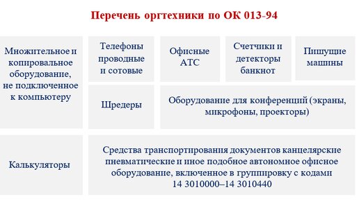 Что относится к оргтехнике: законодательные нормы Действующие нормативные документы в сфере бухучета и налогообложения не дают ответа на вопрос о том, что входит в оргтехнику. Тем не менее бухгалтеру регулярно приходится работать с такими активами — учитывать их в составе основных средств или списывать в расходы в периоде приобретения, а также решать комплекс задач при их списании и ином выбытии. С нюансами списания компьютерной техники вас познакомит этот материал. Термин «оргтехника» отсутствует и в Общероссийском классификаторе основных фондов ОК 013-2014...