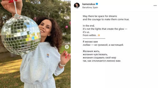 "Я желаю вам любви — не громкой, а настоящей. Желания жить, желания чувствовать, желания создавать свой мир так, как отзывается именно вам. Чтобы хватало сил радовать себя, выбирать себя, идти по своему плану и не извиняться за это. Чтобы было место мечтам и смелости их осуществлять". Настя Каменских, гарна поп-дивчина, она же испанская инфлюенсерша, ну, по крайней мере, пытающаяся ею быть. Ещё в начале декабря прошлого года СМИ писали, что Настя Каменских, гарна дивчина ещё недавнего нашего шоу-бизнеса,...