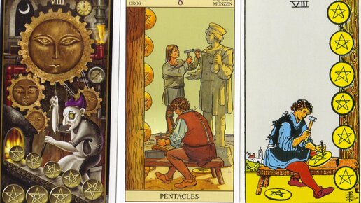 На этой карте изображен мужчина в процессе работы. Видно, что такое занятие ему по душе, что трудится он с увлечением. Этот человек - мастер своего дела. Он способен поделиться своими знаниями и опытом с другими людьми. Восьмерка пентаклей еще раз указывает, что мастерство - ключ к окончательному успеху. Восьмерка Пентаклей передает простое послание о том, что практика - путь к совершенству. Мы видим мастера, который терпеливо работает над воплощением замысла - с гордостью и сноровкой. Восьмерка Пентаклей показывает, что тренировки приводят к мастерству и дисциплине...