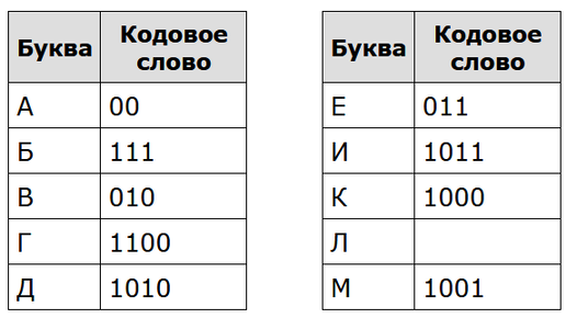 1. По каналу связи передаются шифрованные сообщения, содержащие только прописные буквы русского алфавита. Для передачи используется неравномерный двоичный код. Для букв А, Б, В и Г используются кодовые слова 00, 01, 100 и 1100 соответственно. Укажите самое короткое кодовое слово для буквы Я, при котором код не будет удовлетворять условию Фано, при этом в записи самого этого слова должно использоваться более одного символа, а само слово не должно совпадать ни с одним из используемых слов для кодирования букв А, Б, В и Г...