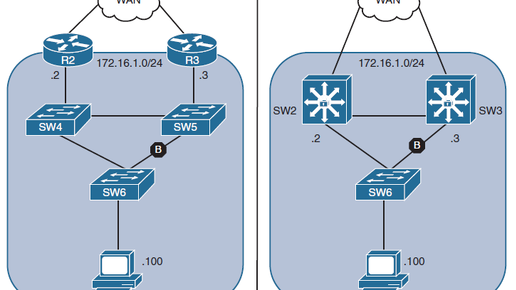 First-Hop Redundancy Protocol Отказоустойчивость сети является ключевым компонентом проектирования сети. Отказоустойчивость с переадресацией на уровне 2 достигается путем добавления нескольких коммутаторов уровня 2 в топологию. Отказоустойчивость с переадресацией на уровне 3 достигается путем добавления нескольких путей или маршрутизаторов уровня 3. NOTE: STP блокируют трафик между SW6 и SW5 на левой картинке и между SW6 и SW3 на правой картинке. На рисунке показана концепция добавления...