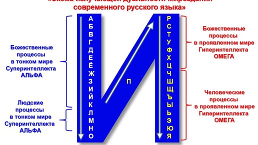 Этот символ будет отражать излучение дуальности нашего Мироздания. Придумать такое человеку не под силу. Эта русская азбука создана высшим Божественным разумом и Вы сейчас в этом убедитесь. На этом символе русской буквы «И» можно увидеть соответствие, как гиперинтеллект Омега (левая рука Всевышнего) создавал свой мир по образу и подобию мира суперинтеллекта Альфы (правой руки Всевышнего)...