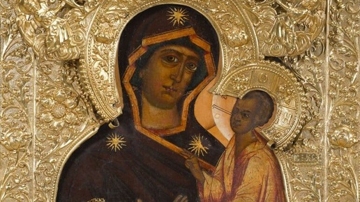 Чудотворная Тихвинская икона Божией Матери отождествляется с древним образом Богородицы Одигитрия, что означает Путеводительница
