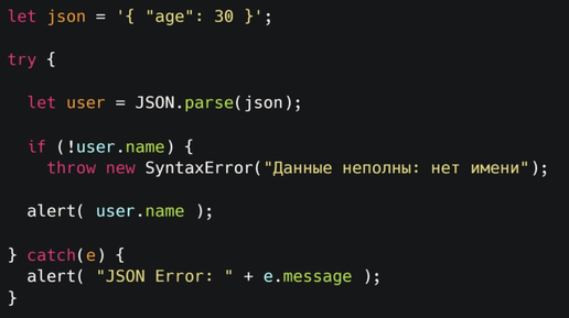 При возникновении ошибки JavaScript обычно останавливается и генерирует сообщение об ошибке. Технический термин для этого: throw an exception (throw an error). JavaScript фактически создаст объект Error с двумя свойствами: name и message. throw Оператор throw позволяет создать пользовательскую ошибку...