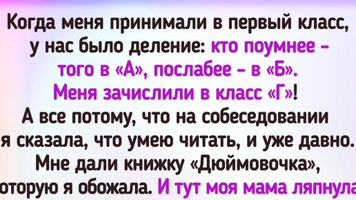 Когда меня принимали в первый класс, у нас было деление: кто поумнее — того в «А», послабее — в «Б». Меня зачислили в класс «Г»! А все потому, что на собеседовании я сказала, что умею читать, и уже давно. Мне дали книжку «Дюймовочка», которую я обожала. И тут моя мама ляпнула: «Да она эту книгу наизусть знает». Я, не открывая книги, начала говорить. Ничего другого прочитать мне не предложили и просто зачислили в класс «Г», где читать не умел никто! Я там умирала от скуки первые полгода. © Ведьма без осла / ADME Отдавала дочку в школу в 6 лет, было тестирование...