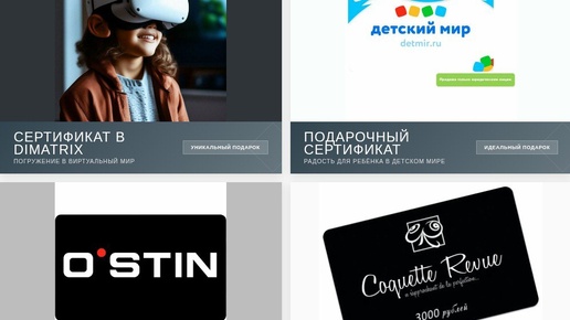 Крутые подарочные сертификаты — отличный выбор для подарка! Ищете, что подарить близким? Подарочные сертификаты — всегда беспроигрышный вариант! Вот несколько идей: — сертификат в клуб виртуальной реальности DiMatrix — для любителей острых ощущений 👉 ya.cc/88z6Cy — электронный сертификат «Детский мир» номиналом 1500 рублей — порадует маленьких непосед 👉 ya.cc/88z6Do — подарочная карта O'Stin номиналом 3000 рублей — для обновления гардероба 👉 ya...