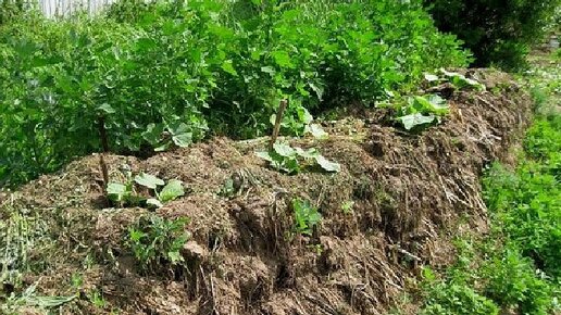 Все знают, что навоз вносят под растения, когда он хорошо перепрел, иначе всё сгорит. У нас соседи, не зная, разложили на радостях в лунки под помидору, думая, что удобряют, что вырастят крупные помидорищи, а всё пожелтело. Куча свежего навоза не очень приятное зрелище, поэтому его можно начать использовать сразу. Во-первых, надо попытаться сформировать его грядкой, чтобы вид был более-менее приличный. Можно вот так. А, можно и поприличнее. . Почему, лучше что-то посадить на навоз? Потому-что...