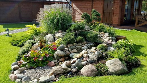 Что проще, оформлять периметр или сделать в центре одну клумбу? Вот так бывает, что можно обойтись и единственной клумбой, а вид будет живописный. Всё остальное засеять газоном или замостить, если нет желания упахиваться в саду. Ключевым здесь станет месторасположение и размеры самой клумбы, об этом в конце статьи. Если правильно всё рассчитать, то будет не хуже, чем сад, полный растений. Может повезёт и соседи посадят за забором лес, тогда вообще халява! В помощь нам здесь будут крупные камни, они займут пространство, создадут форму, и их не нужно поливать, совсем...