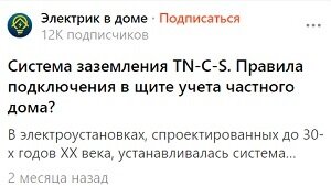 На канале Электрик в доме 22 октября 2022 г. опубликована статья «Система заземления TN-C-S. Правила подключения в щите учета частного дома?»: Название и содержание статьи свидетельствует о некомпетентности лица, её подготовившего. Рассмотрим только введение статьи: Автор доказал свою некомпетентность, продемонстрировав отсутствие знаний терминологии и требований к электроустановкам зданий. Он выдумал «систему заземления», которая нет в ни в главе 1.7 ПУЭ, ни в ГОСТ 30331.1. В ГОСТ 30331.1 определена система распределения электроэнергии...