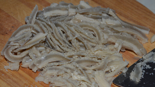 Рубец это продукт, который умеют готовить, а уж тем более едят далеко не все. Купленный на рынке неочищенный рубец может оттолкнуть даже самого стойкого кулинара. Ну а уж домашних тем более. Но сейчас в продаже есть рубцы, у которых нет неприятного запаха, белые и чистые. Технологии не стоят на месте. Как правильно варить рубец я писала в своей статье. Нажимайте на название. "Как приготовить рубец вкусно" Отварной рубец режем на кусочки. В данном случае как можно тоньше. Добавляем репчатый лук. Примерно одну треть от объема рубца...