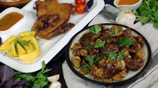 Приветствую Вас! Сегодня спешу поделиться 2-мя способами приготовления утки! Первый способ - ароматная утка с красивой и хрустящей корочкой в духовке. Подавать будем с кисло-сладким соусом домашнего приготовления! Второй способ готовится на обычной сковороде с грибами, приправами и получается сочной, нежной за счет небольших хитростей. Ни кто и не догадается, что это утка! Итак, два рецепта-одна домашняя утка! Ароматная утка в духовке с кисло-сладким соусом ИНГРЕДИЕНТЫ: половина утки 5 веточек тимьяна 50 гр...