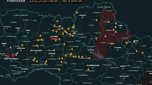 Украинские ресурсы опубликовали карту дронов и ракет над территорией страны. В то же время в воздушном пространстве страны зафиксировано уже более двадцати ракет различных типов, летящих с разных направлений. Об этом 23 декабря написал Телеграм-канал Украина.ру Над Украиной вновь нависла угроза масштабной атаки. По данным мониторинговых ресурсов, в воздух подняты три российских истребителя МиГ-31, являющиеся носителями гиперзвуковых ракет "Кинжал". Удары наносятся по объектам в центральной и северной части страны...