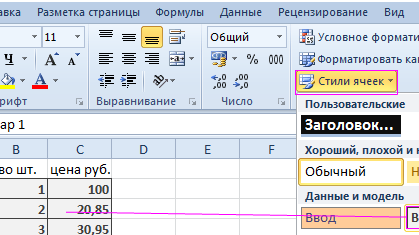 О стилях Использование стилей обеспечивает единообразие оформления данных и ячеек во всей книге, позволяет быстро устанавливать выбранный набор параметров форматирования, а также мгновенно изменять оформление всех ячеек, к которым применен один стиль. Стилем называется набор параметров форматирования данных и ячеек: числовой формат; Стиль не обязательно должен включать в себя все параметры форматирования. При изменении параметров стиля автоматически изменяется оформление всех ячеек, к которым применен изменяемый стиль...