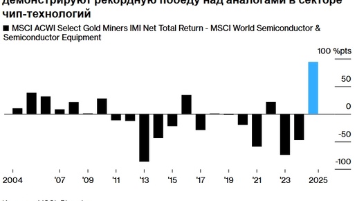 Индекс мировых золотых акций MSCI вырос примерно на 135% за год, следуя за ростом золота, которое подорожало более чем на 45% и достигло новых исторических максимумов. Индекс акций золотодобывающих компаний торгуется в 13 раз выше прогнозируемых будущих прибылей, что немного ниже среднего уровня за последние пять лет. Несмотря на широкий интерес к искусственному интеллекту и значительный рост акций производителей микросхем в этом году, инвестиции в золотодобывающие компании оказались более перспективными...