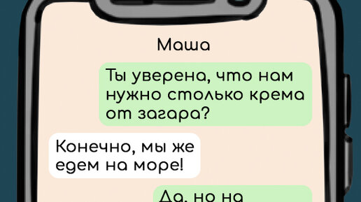 Привет, дорогой друг! Как же приятно собираться в отпуск. Складывать чемодан, докупать пляжные полотенца и жарить в поезд курочку! Однако, долгие сборы могут спровоцировать ряд проблем. Например, может выяснится, что кому-то мал прошлогодний купальник, а кто-то не готов к погоде на курорте. Лучше ехать в отпуск спонтанно! Меньше ожиданий – меньше разочарований. Но так получается не всегда. Сегодня я собрал 7 смешных переписок, в которых люди собираются в дальнюю дорогу и не могут определиться что с собой брать...