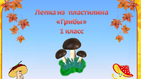 Урок: ручной труд Тема: лепка «Грибы» Цель: обучить конструктивному способу лепки многодетальных предметов. Задачи: 1. формировать представление о предметах природного мира группы «Грибы», умение отличать съедобные и несъедобные грибы, закрепить приёмы лепки. Обучать работе с опорой на пооперационный план с частичной помощью учителя. 2. развивать мелкую моторику рук, наблюдательность, воображение, творческое мышление. 3. воспитывать художественно-эстетический вкус детей, терпение, старание и аккуратность в работе; воспитывать бережное отношение к природе...