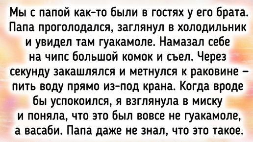 Еда — это не только способ насытиться. Это проявления любви, неожиданные открытия и даже проверка отношений. Как показывают эти истории, обычный прием пищи может превратиться в настоящее приключение. Как-то мы купили порошок и поставили его в один шкаф с мукой. В общем, мука пропиталась запахом порошка, а жена потом испекла из нее печенье. Они получились вкусные, но с ароматом стирального порошка. Тем не менее мы их ели. Но с каждым днем ели все меньше и меньше. Садимся сегодня за стол, жена говорит: — Кушайте печеньки, берите...