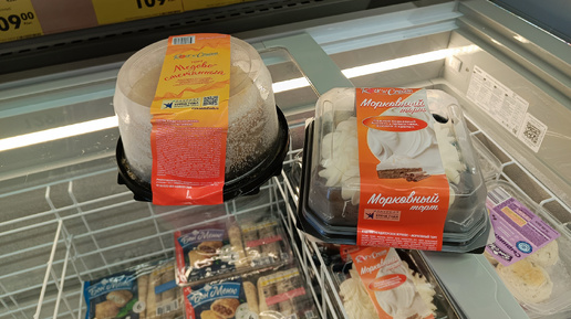 Пора пополнить холодильник, и я направилась в ближайший «Чижик». В последнее время эти магазины стали весьма популярны в нашем городе, и теперь их можно найти практически в каждом районе. Хоть я и не покупаю там всё, но некоторые товары действительно заслуживают внимания, а постоянные скидки делают этот магазин привлекательным для повторных визитов. В одном из холодильников сразу привлекают внимание два торта, из которых можно выбрать: "Морковный" и "Медово-сливочный". Оба торта массой 500 граммов по цене 399 рублей...