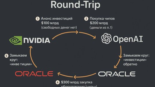 То, что сейчас происходит в мире больших ИИ-технологий, — это не просто очередной бум. Это самый грандиозный финансовый спектакль нашего времени, и я хочу показать вам его полную схему. Давайте посмотрим, как работают анонсы на $700+ миллиардов, которые за последние недели обрушили на нас OpenAI, Nvidia, AMD и Oracle. 💰 Вот как выглядит круговая сделка (Round-Trip): 1. Nvidia анонсирует инвестиции в OpenAI на сумму $100 млрд. (При этом у Nvidia таких свободных денег физически нет). 2. OpenAI тут же заявляет о покупке чипов у Nvidia на $200 млрд...