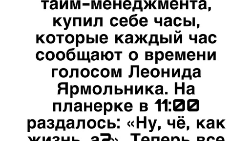 1. Пунктуальность прежде всего Мой начальник, большой сторонник тайм-менеджмента, купил себе часы, которые каждый час сообщают о времени голосом Леонида Ярмольника. На планерке в 11:00 раздалось: «Ну, чё, как жизнь, а?». Теперь все наши встречи непроизвольно начинаются со смеха. 2. Генеральная уборка Решил помыть окно. Отодвинул горшок с кактусом, чтобы он не мешал. Помыл окно, протёр подоконник, поставил кактус на место. Через час обнаружил, что тщательно протёр пыль со всех сторон... кроме той, что был прижат к окну...