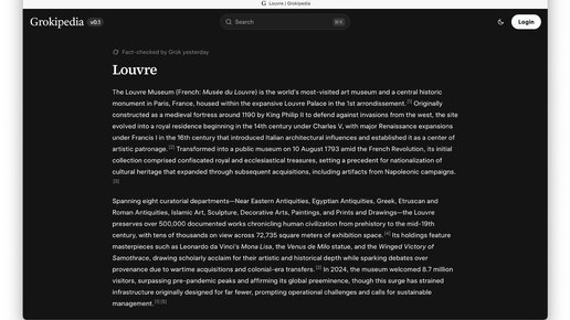 📚 ЗНАКОМЬСЯ: GROKIPEDIA — ВИКИ ОТ ИЛОНА МАСКА Вот что я нашёл: Grokipedia — новая википедия, созданная Илоном Маском на ИИ. В ней уже более 885 тысяч статей, но главное — фактчекинг делает не народ, а сама система Grok. Это значит меньше фейков и больше доверия. Забудь про навязанные взгляды. Grokipedia обещает гонять идеологию и давать массу ссылок: например, в статье о Лувре их больше 200 — чтобы можно было углубиться самому...