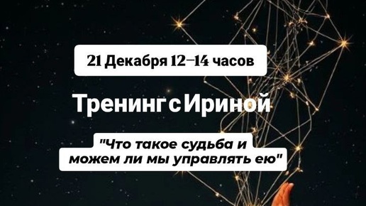 ✨ 21 декабря | 12:00–14:00 ✨ Тренинг с Ириной «Что такое судьба и можем ли мы управлять ею?» 🌈 Судьба — это приговор или сценарий, который можно переписать? Можно ли понять, что вы идёте своим путём — и что делать, если чувствуете, что сбились с курса? 🔹 Новый формат живого тренинга 🔹 Продолжительность — 2 часа 🔹 Практика + разбор реальных ситуаций 🚩 На тренинге вы узнаете: что такое судьба и из чего она складывается можем ли мы влиять на её ход и как именно как распознать...