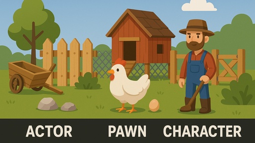 Всем привет! Давайте представим, что мы разрабатываем игру про птицеферму и у нас есть множество ассетов: куры, яйца, цыплята, курятник, кормушки, заборы, ворота, сетка-рабица, тележки, мешки с кормом, камни, кусты, деревья и много-много всего. Все это можно разместить на сцене, а значит, все это акторы (Actors). Actor — это базовый класс всех объектов, которые могут существовать в игровом мире. Актор может включать в себя различные компоненты (Components), которые определяют его внешний вид, поведение и взаимодействие с окружением...
