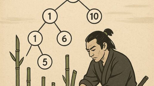🌳 Бинарное дерево поиска (BST) — кладём числа «как в огороде» Садовник‑самурай сортирует бамбуковые палки по длине. Он втыкает первую палку в землю — это центр грядки. Любая короче идёт влево, длиннее — вправо. Для каждой новой палки правило повторяется: слева короче, справа длиннее. Через минуту получилась «живая диаграмма», в которой нужную длину легко найти. Вот это и есть бинарное дерево поиска. Как оно работает на пальцах 1. Первый элемент — «корень». 2. Всё, что меньше, кладём слева; больше — справа...