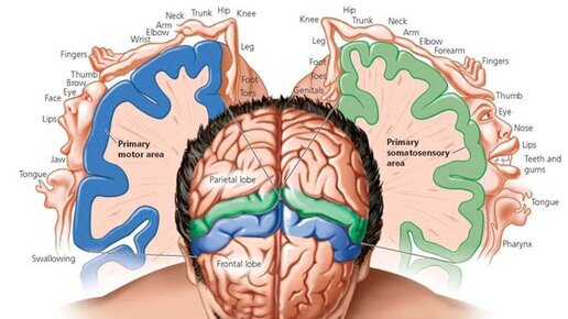 У нашего мозга есть так называемая сенсорная и моторная кора. Это область коры, в которой располагаются разные части тела. Для мозга мы выглядим не совсем так, как есть на самом деле и некоторые маленькие по размеру части тела занимают бОльшую часть сенсорной и моторной коры. Сенсорная часть - это то, как мы чувствуем части тела, а моторная отвечает за движение. Стоит отметить, что мы не сможем двигать тем, что не чувствуем. Поэтому в моих тренировках вы часто встретите сенсорную разминку перед суставной гимнастикой...