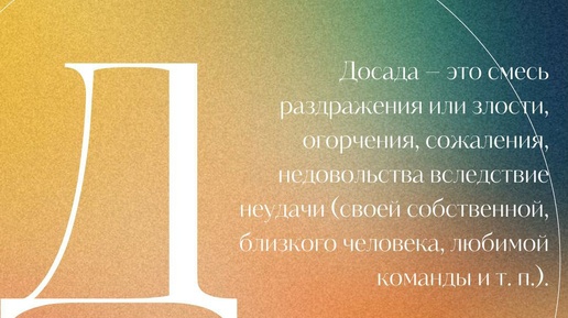 Досада – это смесь раздражения или злости, огорчения, сожаления, недовольства вследствие неудачи (своей собственной, близкого человека, любимой команды и т. п.). Мы можем злиться на обстоятельства, время, страну, группу людей или одного человека, помешавших достижению задуманного, или в целом на «судьбу-злодейку», а также «на весь белый свет». Злость при досаде часто выражается («разряжается») с помощью «крепкого» словца, бывает, что и нецензурного. Иногда мы настолько погружаемся в досаду, что страдаем, словно, от болезненной раны, которая саднит и беспокоит...
