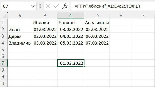 ГПР ищет значение в первой строке таблицы и возвращает другое значение в том же столбце из строки в соответствии с заданным условием...