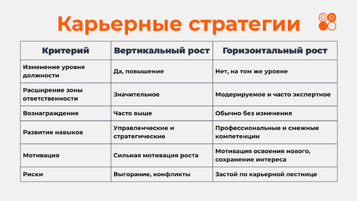 Что значит вертикальный и горизонтальный карьерный рост, в чем преимущества каждого типа и как развивать сотрудников для максимальной мотивации и удержания талантов в компании — узнайте в новой статье. Вертикальный и горизонтальный карьерный рост — два направления развития сотрудников в компании. Вертикальный карьерный рост предполагает движением вверх по служебной лестнице — повышение должности и расширение ответственности. Горизонтальный — увеличение компетенций и опыта в том же уровне, переквалификация или смена ролей в пределах организации...