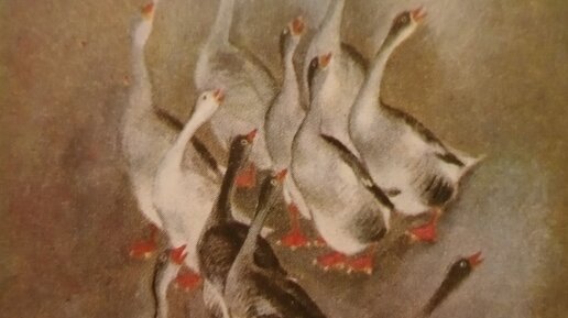 Гуси — птицы водоплавающие. У них длинная шея и короткие красные или оранжевые ноги. Ходят они важно, вразвалку. Три передних пальца каждой ноги соединены плавательной перепонкой.