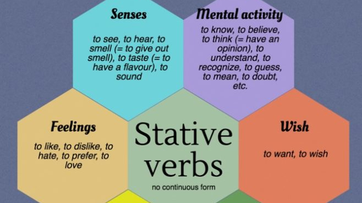 Stative Verbs — глаголы состояния, а не действия предмета или человека. Это глаголы, которые не употребляются во временах группы Continuous (то есть длительной форме). Их называют stative verbs или state verbs от слова «state», которое обозначает «состояние» или «положение». Группы глаголов stative verbs: