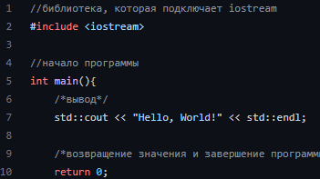 На прошлом уроке мы создали свою первую программу на языке C++. В этом уроке мы изучим структуры программы. Части первой программы проанализируем программу, которую мы написали на прошлом уроке. примечание некоторые строки начинаются со знаков // и /* они называются комментариями, программа не считывает их, но они полезны для понимания процесса выполнения программы. более подробно комментарии мы изучим позже. Что такое include include<имя файла> указывает взять содержимое файла, в данном случае iostream...