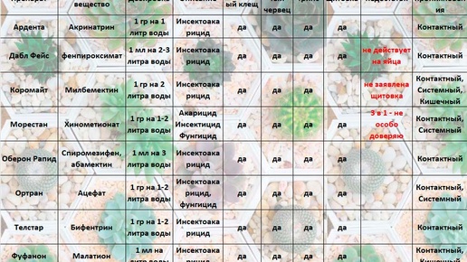 Цель – выбрать два препарата: 1. Препарат для первичной (входной) обработки купленных растений. 2. Препарат для первой обработки при обнаружении вредителей (в этом случае рекомендована трехкратная обработка разными составами - до следующей обработки будет 7-10 дней – достаточно для заказа еще двух средств). Отобрала 47 препаратов от основных вредителей комнатных растений: паутинный клещ, мучнистый червец, трипсы и щитовка. Да, есть еще грибные комарики, но тем, кто занимается суккулентами они не страшны – тут все решает просушка, которая у суккулентов обязательна...