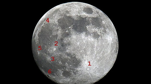 Все знают, что на Луне есть кратеры, моря и океаны. Моря видно невооружённым глазом, а вот чтобы рассмотреть даже самые крупные кратеры, придётся вооружиться хотя бы биноклем. И вот мы смотрим на Луну в бинокль, или фотографируем её на фотоаппарат с длиннофокусным объективом. Видим кратеры. Но где какой? Ниже представлен снимок Луны примерно с пятикратным увеличением (снято автором в апреле 2019 года. За несколько часов до полнолуния), с обозначением шести наиболее различимых (по мнению автора) кратеров...