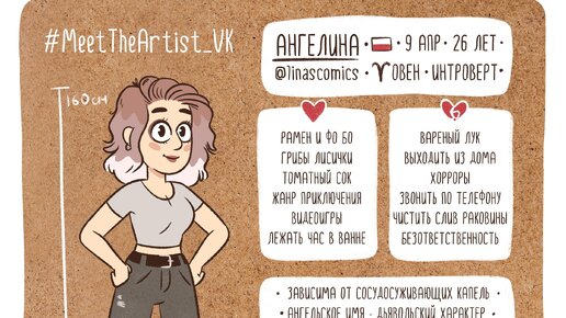 Привет, дорогой друг! Интересно, что ты обо мне знаешь? Если ты давно следишь за моим творчеством, то ты, наверняка, в курсе, что я обожаю кошек, залипать за компом до четырех часов утра и собирать лего. А что, если собрать всю информацию о себе в одном комиксе? Чтобы читатели сразу знали, с кем имеют дело). Так и появился челлендж #MeetTheArtist_VK». Классные художники раскрыли все свои секреты: рассказали, что любят и ненавидят, и даже – какие вещи носят с собой в сумке. Я назвал эти комиксы – анкетами...