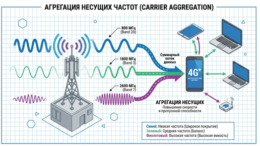Представьте, что интернет — это автомобильная дорога, а данные — это машины. Обычное 4G-подключение использует только одну полосу движения. Если много машин (данных), образуется пробка, и скорость падает. Агрегация частот (по-научному Carrier Aggregation, CA) — это как если бы мы расширили дорогу до нескольких полос вместо одной. Теперь машины могут ехать параллельно по разным полосам, и пробок почти нет! 🚗💨 То есть, скорость интернета увеличивается в 2-3 раза за счёт одновременного использования нескольких частотных каналов...