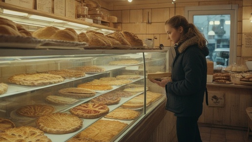 Томск, вечер. Я возвращался в гостиницу голодный, и небольшая пекарня рядом с ней, вся светящаяся и заманивающая, казалась спасением. Захожу. На витринах – многообразие пирогов размером где-то 40 на 60 см, которые для покупателей режут на куски по их просьбе. Из голодающих я один, за прилавком – молодая девчонка, которая спрашивает, чего мне хочется. Я долго выбираю, потому что всё вкусно, всего хочется, но лопнуть не входит в мои вечерние планы. Наконец выбираю непочатый пирог и прошу кусок от него...