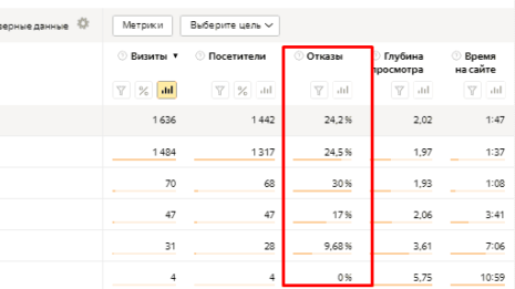 Разберём такой важный показатель, как "процент отказов". Лицезреть его можно в сервисе Яндекс.Метрика