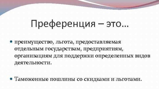 Преференция - это преимущество или льгота, предоставляемая определенным категориям стран, организаций или гражданам. Происходит от латинского слова praeferentia - «предпочтение».Преференция проявляется в предоставлении скидок, снижения налогов, предоставлении кредитов с пониженной процентной ставкой и пр. Например, отсутствие таможенной пошлины на ввоз определенных товаров - это и есть преференция. Скидочная карта постоянного покупателя в магазине - это тоже вид преференции для граждан. В госзакупках преференция - это льготы для определенных товаров российского производства...