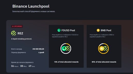 REZ - это токен LRT-протокола Renzo для рестейкинга ETH. Токен предназначен для голосования по ключевым решениям, влияющим на функционирование протокола Renzo. Как можно получить токен REZ на Binance Launchpool На платформе Binance Launchpool будет проводится фарминг токена REZ с 24 по 30 апреля 2024 года. Для получения токена REZ необходимы BNB и/или FDUSD. Всего будет распределено 250 000 000 REZ . Сроки проведения фарминга REZ Старт: 24 Апреля 2024 года (3:00 мск). Завершение: 30 Апреля 2024 года (2:59 мск)...